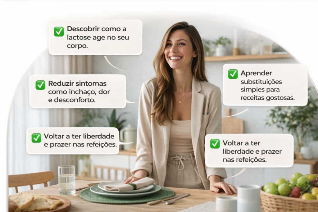 Aprenda a reconhecer padrões no seu corpo e evitar erros comuns que prolongam o mal-estar. - Substituições inteligentes que preservam o prazer de comer Descubra alternativas simples à lactose, sem perder sabor, rotina ou momentos à mesa.